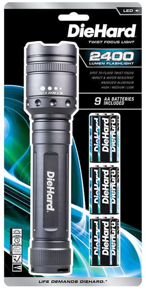 When only the brightest light will do, the DieHard twist focus 2400 Lumens flashlight has you covered. With an amazing 2400 Lumens of power and an incredible beam distance of 300 m, this light has the distance and power to light up any situation. Durable Pro Grade anodized aluminum construction gives this light a quality feel and finish that is both comfortable and well balanced. With impact and water-resistant design, rubber booted tail cap switch and a heavy-duty, non-slip True Grip handle this light is ready for the toughest jobs. Twist Focus technology lets you move seamlessly from a spot to flood beam and any point in between allowing you to tailor the powerful 2400 Lumen beam to your needs. Light settings of high, medium and low mean you will always have the right amount of light for any given task. A flash setting is also included for safety. Other features include 2.5 hr of run time on nine AA batteries, as well as a unique design which allows the light to stand on its end for hands free lighting. The DieHard twist focus light includes nine premium DieHard AA batteries.