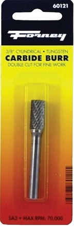 Forney 60121 Burr, 3/8 in Dia Cutting, 1/4 in Shank, Cylinder Shank, Tungsten Carbide Cutting Edge