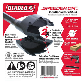 Diablo's new two-cutter self feed bits are designed to strict tolerances in the heat forging manufacturing process resulting in energy efficient drilling with up to 2X life per battery charge. Diablo self feed bits two-cutter design and an aggressive low thread count feed screw deliver up to 2X more holes per charge. The replaceable feed screw features a pull out stop mechanism that prevents the screw from slipping out when the bit is removed from the material. The combined innovative engineering of Diablo self feed bits make them the ideal choice for making holes up to 2X faster in soft woods.