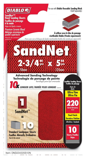 Diablo SandNet Sanding Sheet, 2-3/4 in Length, 220 Grit, Aluminum Oxide Abrasive, Applicable Materials: Metal, Plastic, Wood, Suitable for: Diablo Reusable Sanding Block