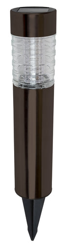 Solar bollard light features with 3 lumens. Metal/rib, glass and plastic construction. Bronze color. Batteries included.