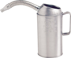 Deluxe galvanized measure with spill proof top. Flexible spout for ease of pouring. Rolled edge, easy-grip handle. Calibrated fill line.