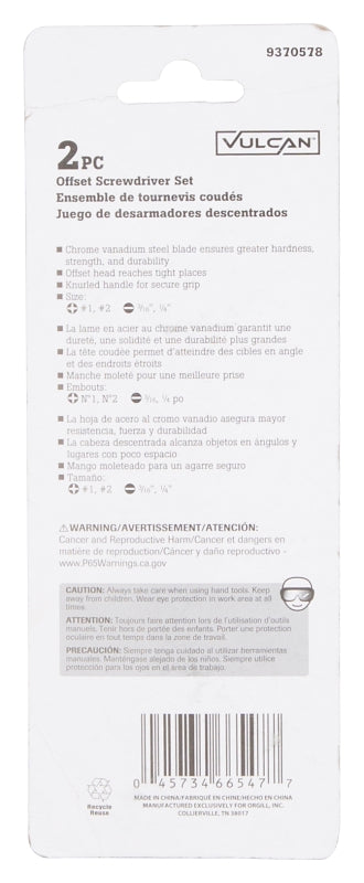 The Vulcan Screwdriver Offset Set 2PcHeat treated and chrome plated for durability, knurled handle for sure grip. It's offset heads reach targets in angles and tight places. The set includes one each: Slotted 3/16 in and Phillips #1, Slotted 1/4 in and Phillips #2.