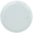 Non-metallic white ceiling box cover, flat and blank. 4 in Dia. UL listed.